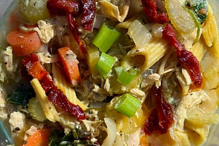 One-pot sun-dried tomato rotisserie chicken noodle soup